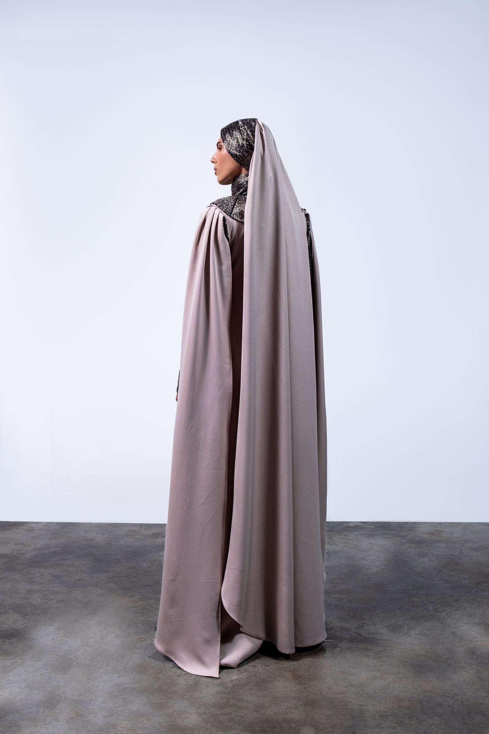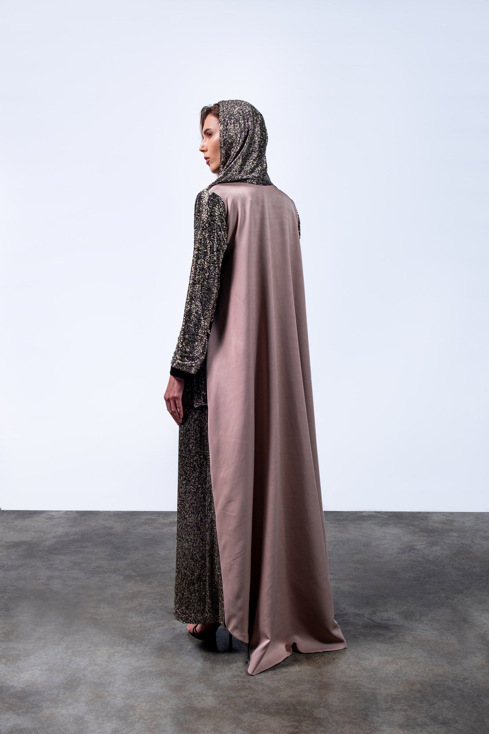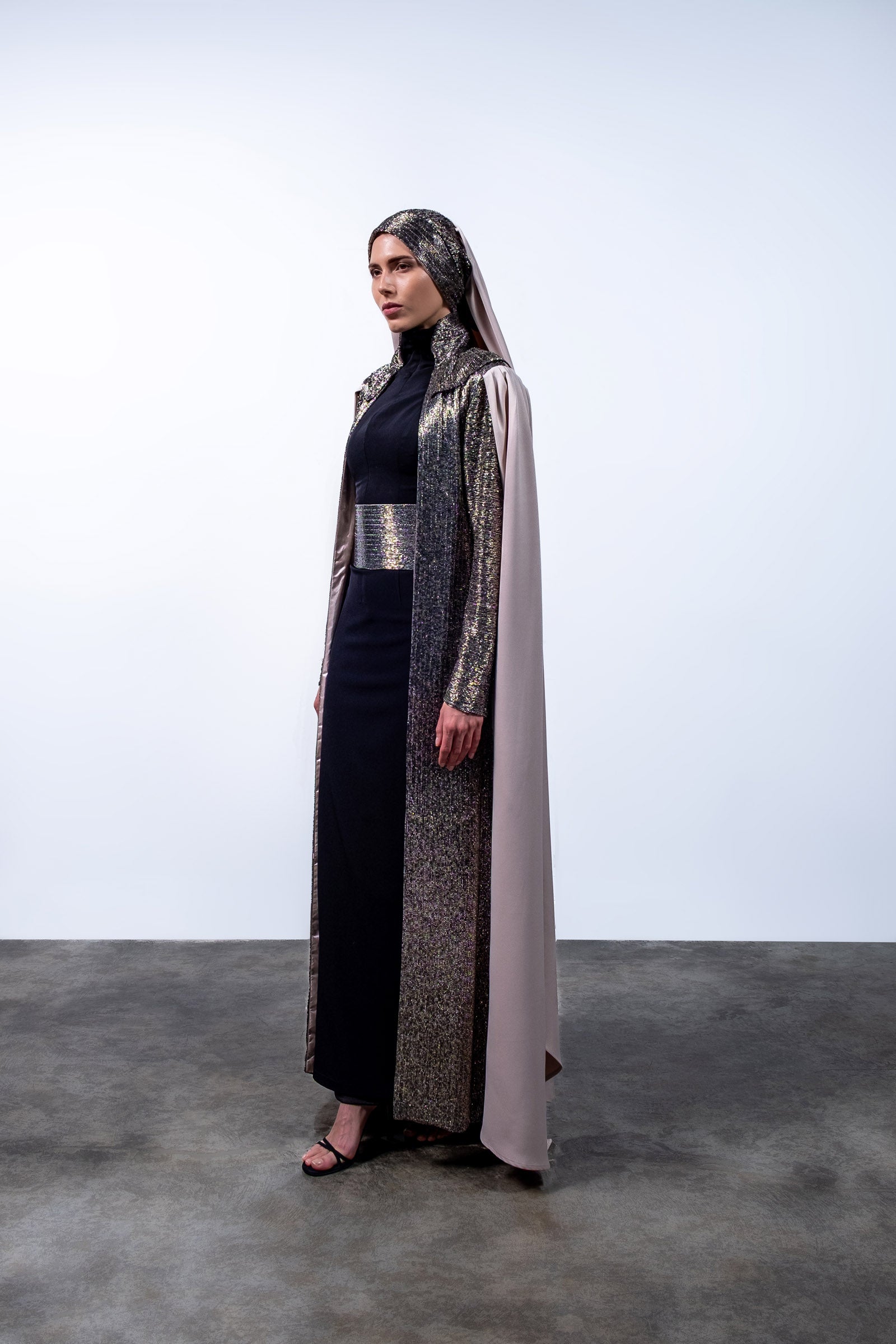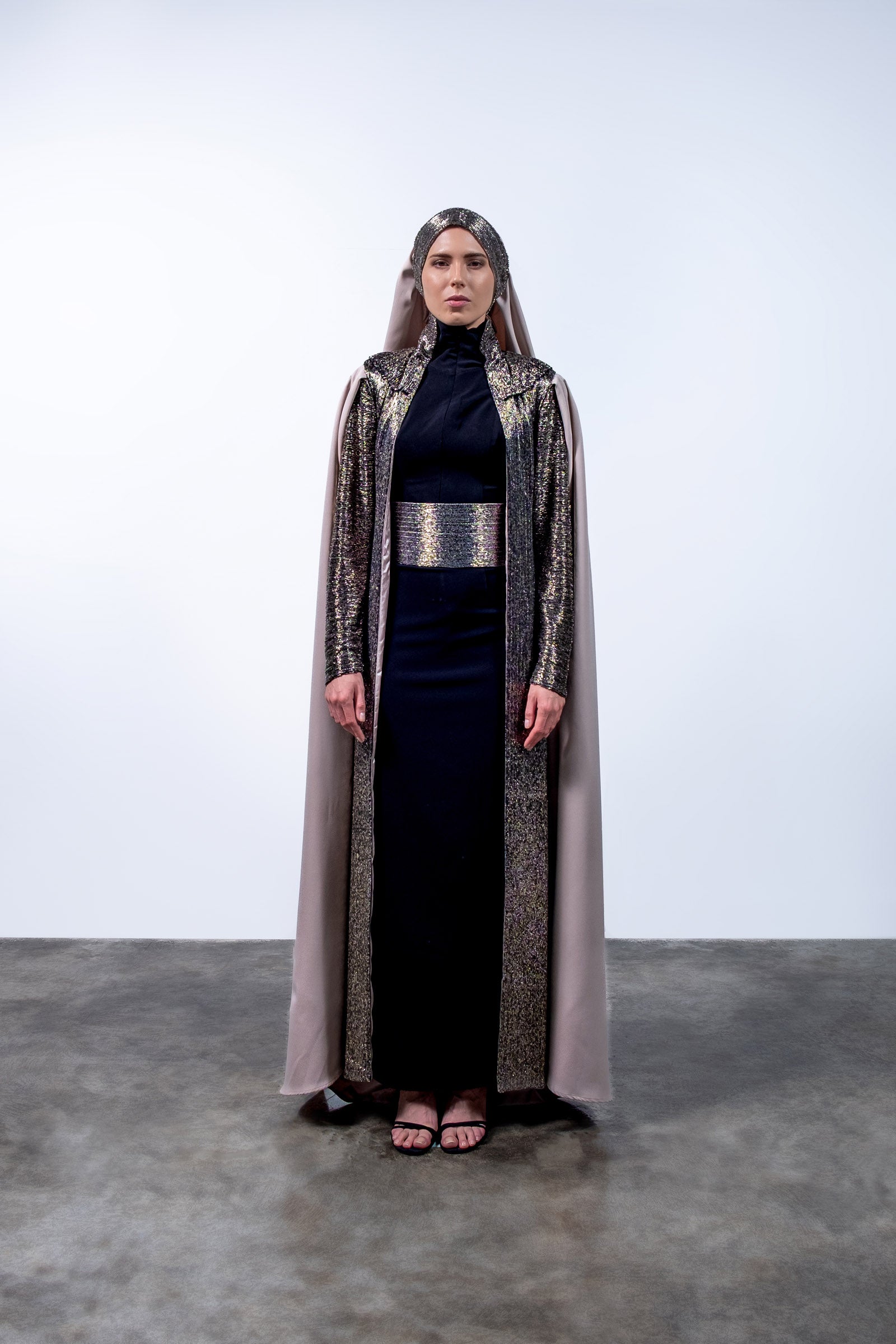 عباية الإمبراطورة السماوية، مزيجٌ ملكيٌّ بين الأصالة والحداثة، تجسّد السلطة الإلهية والأناقة السماوية. تتساقط الأقمشة المعدنية على الكتفين كدرعٍ مصنوعٍ من غبار النجوم، بينما تنسدل ثنياتٌ ناعمةٌ بلون البيج خلفها كعباءةٍ سماوية، لتوازن بين القوة والرقة في تناغمٍ تام. يُطيل الفستان الأسود الأساسي ذو التصميم الهندسيّ قوام المرأة بدقةٍ متناهية، مُثبّتًا بحزامٍ لامعٍ بارزٍ يُتوّج الخصر ببريقٍ كونيّ. تُكمّل قطعة الرأس المعدنية المتناسقة الإطلالة، مُحوّلةً من ترتديها إلى ملكةٍ عصريةٍ - قوية، لا تُقهر، ومتسامية. يُكرّم هذا التصميم الجلال المتواضع، بينما يُعيد صياغة قواعد الأزياء الاحتفالية للمرأة التي تقود بقوةٍ صامتة.