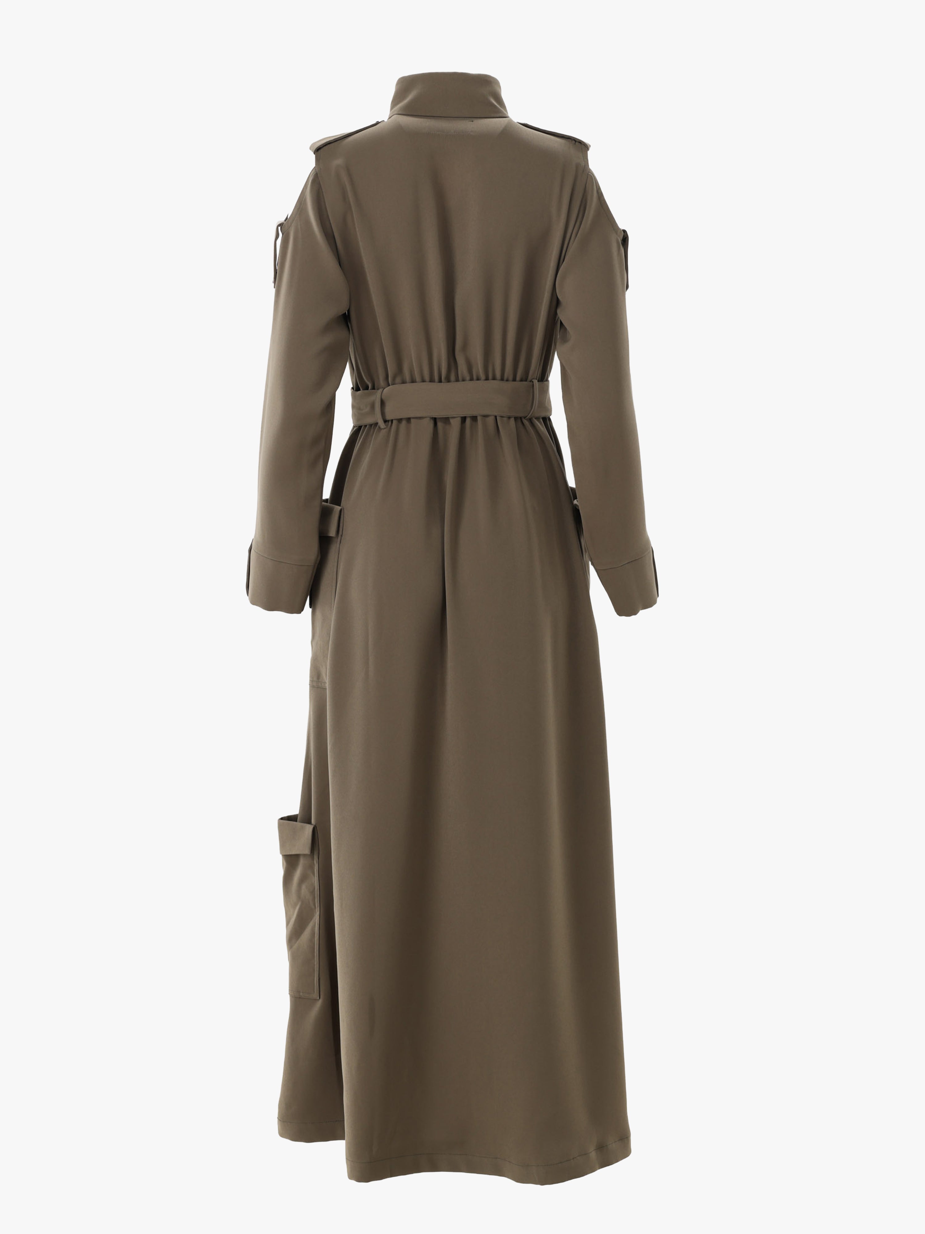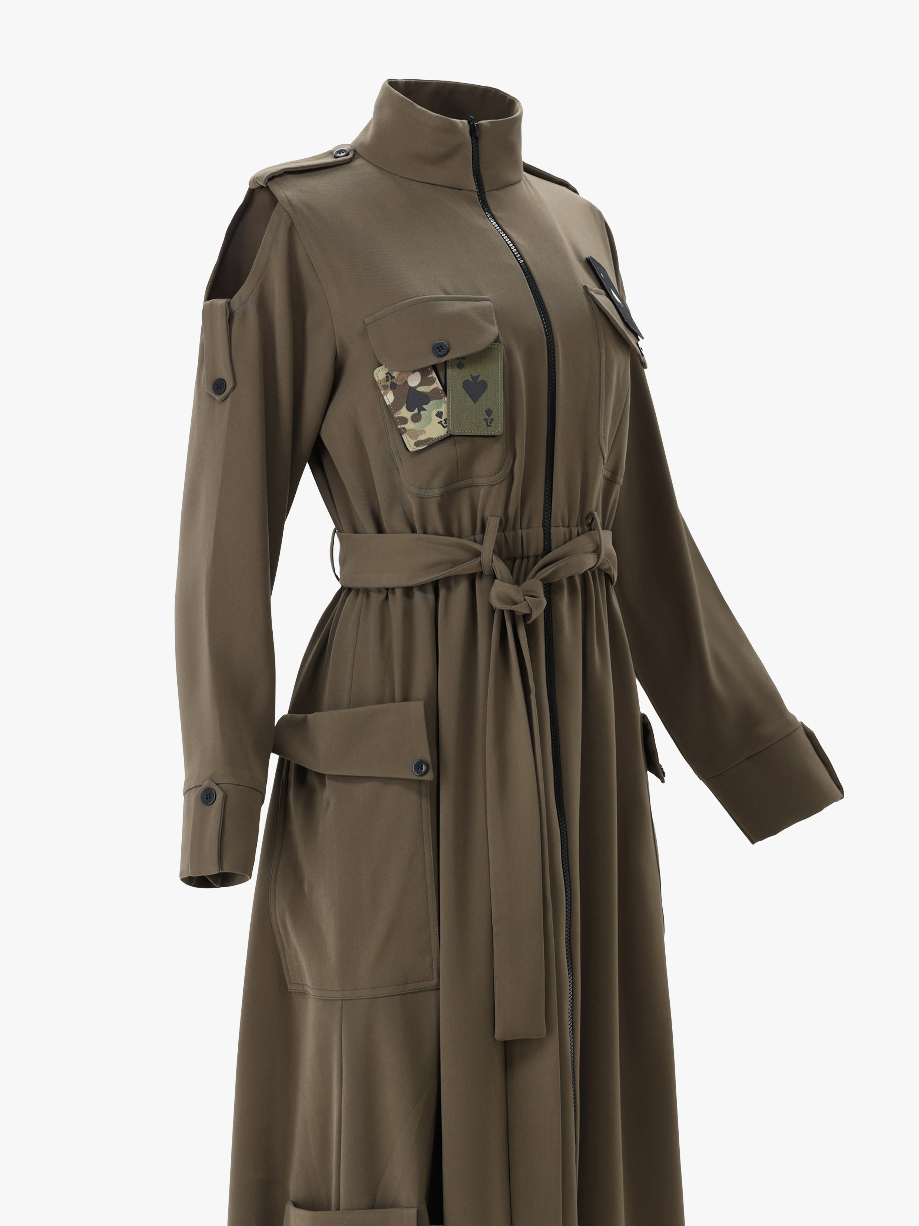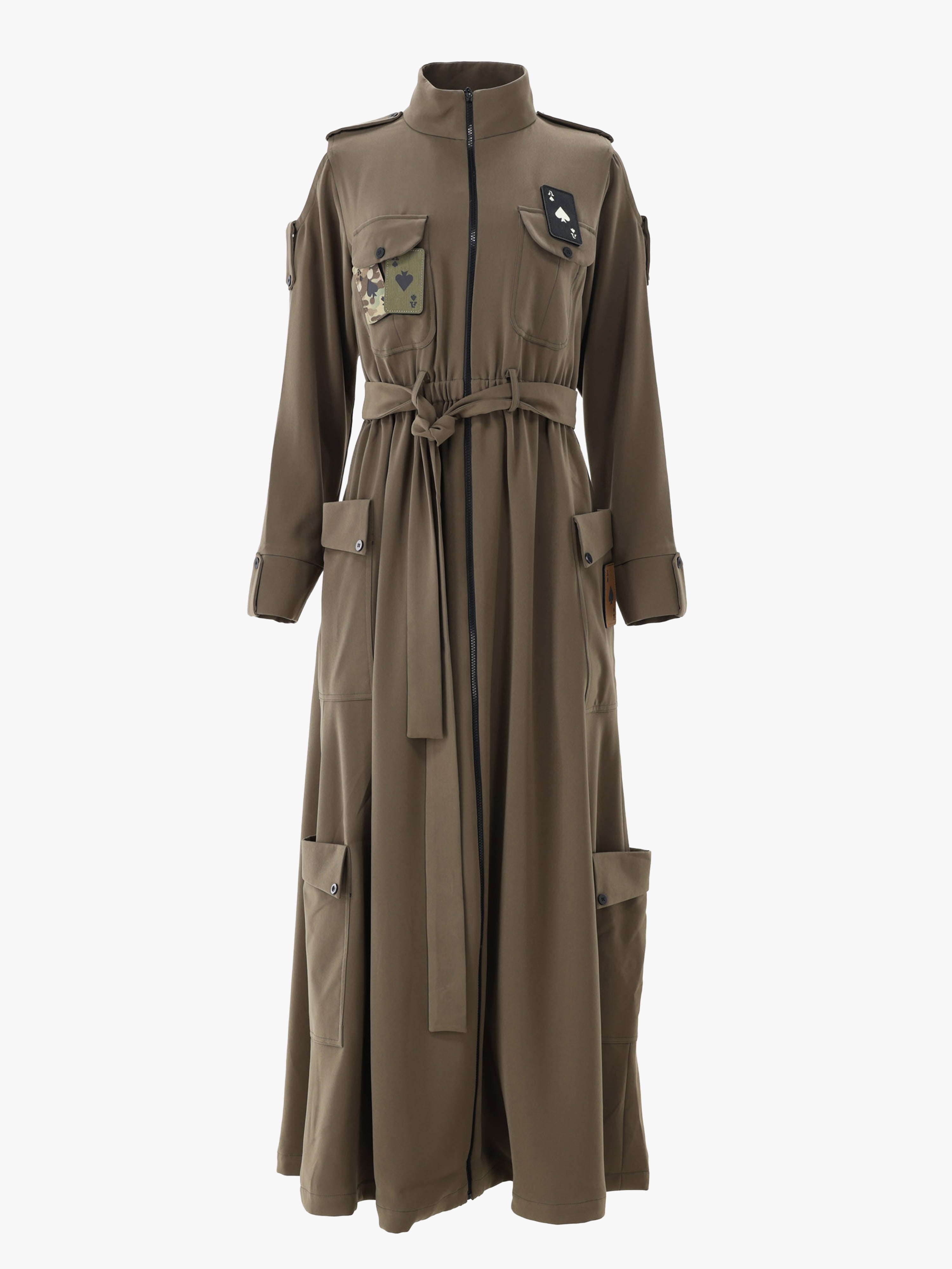 يجمع هذا التصميم بين الأناقة الرسمية والعملية العملية، في ازدواجية بين الرقي والجاهزية. مستوحى من الدقة العسكرية والرقي الحضري، يعيد العباءة ابتكار ملابس العمل من خلال منظور عصري وعملي.