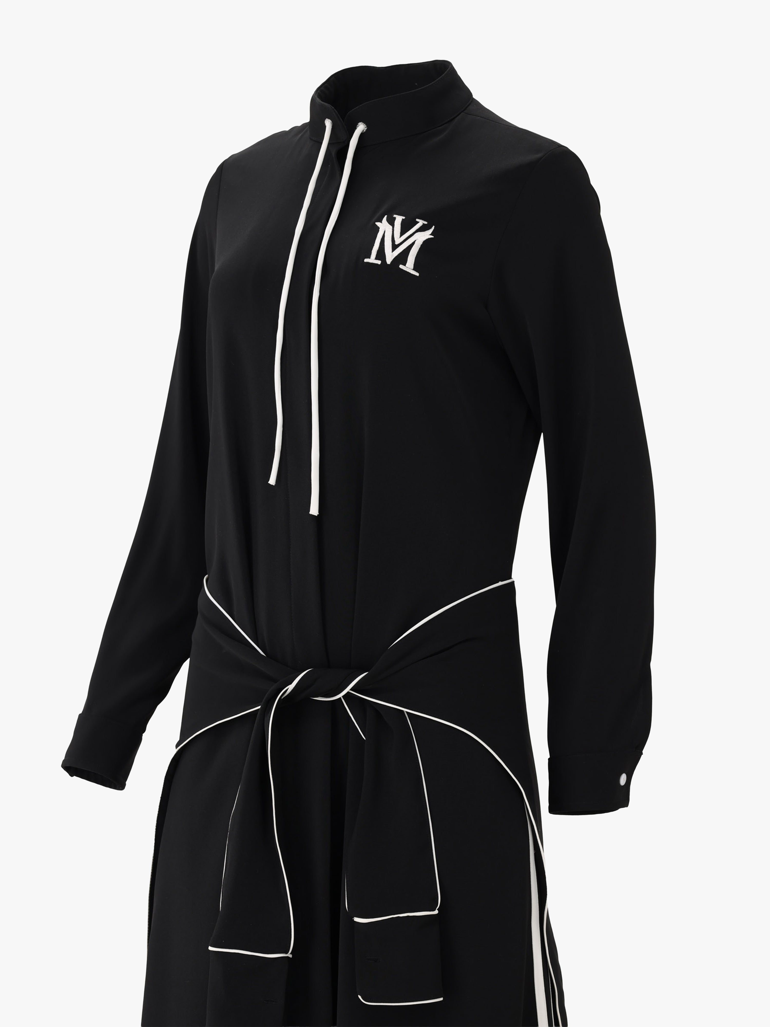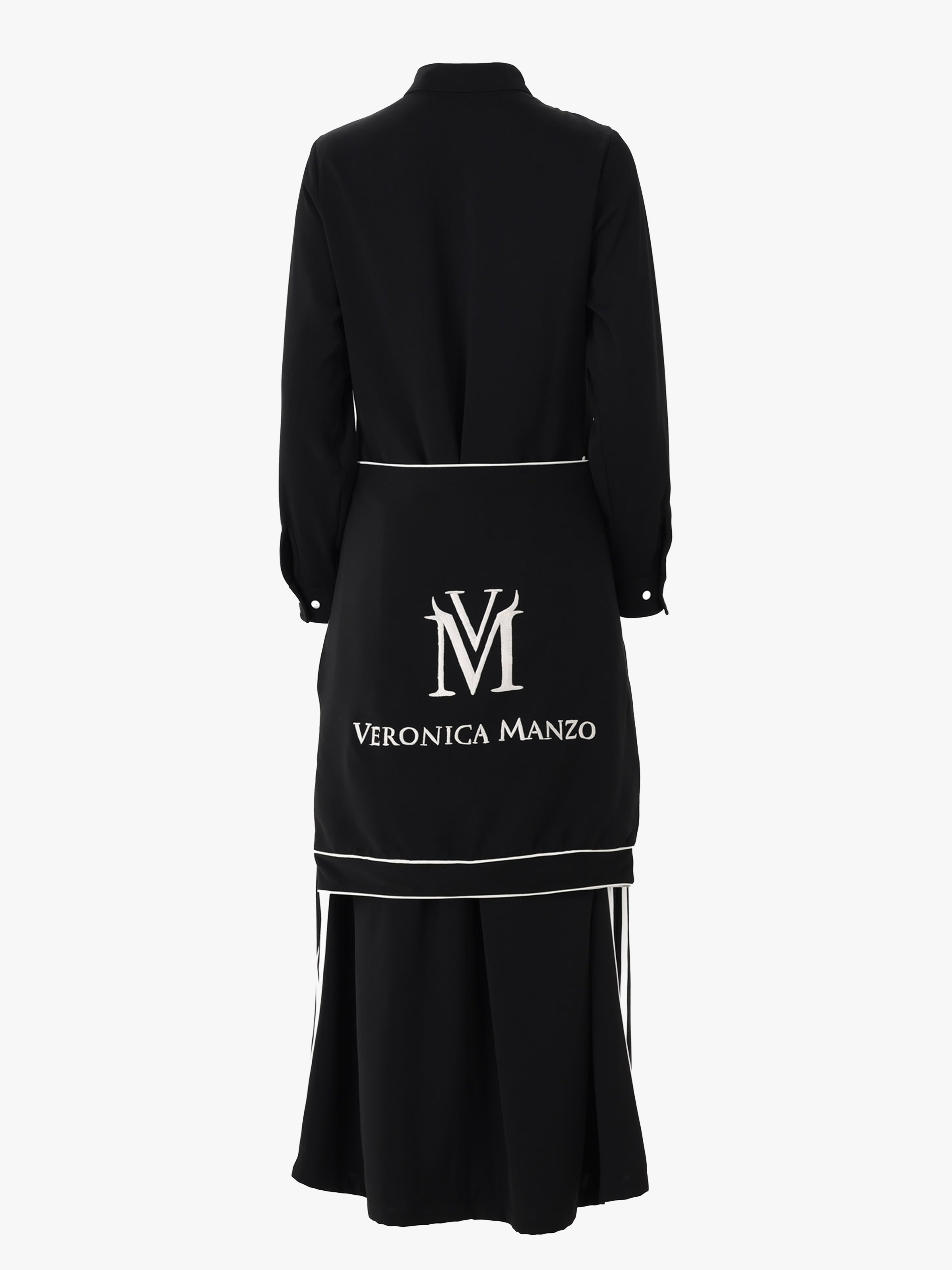 This look reimagines sport elegance through the lens of refined modest couture. A fluid, wide-leg abaya-dress hybrid flows with movement, grounded by tailored structure and athletic DNA. The high collar and contrast drawstrings bring a street-lux feel, while the monochrome palette keeps the look fierce and minimal. Signature VM embroidery on the chest and back transforms branding into identity—not loud, but assertive. The wrap-around waist detail mimics the casual gesture of tying a jacket, yet is engineered into the garment, merging comfort with architectural intent. Striped side panels elongate the silhouette, giving an illusion of height and motion—a uniform for the woman who moves with purpose, elegance, and self-mastery.