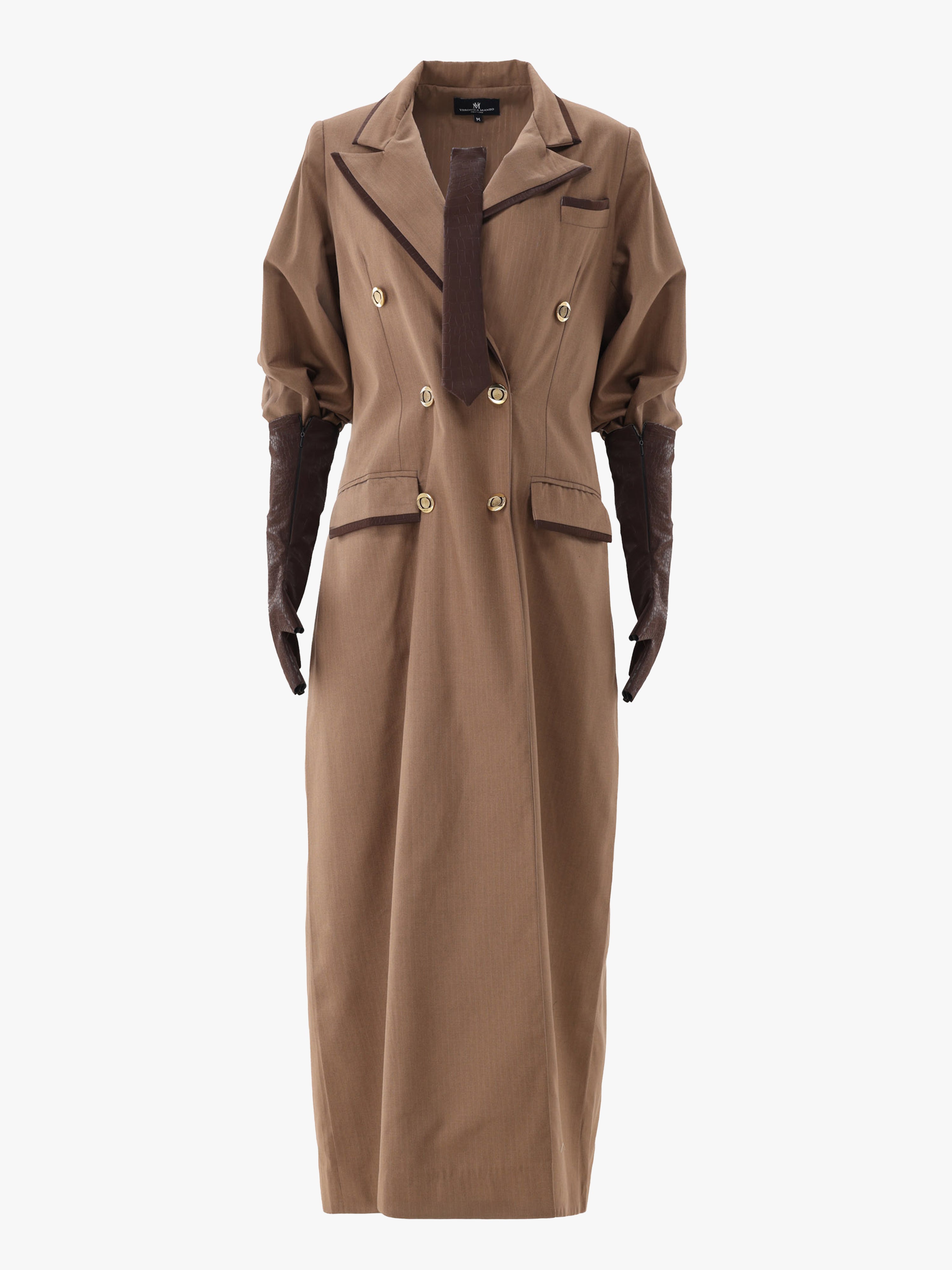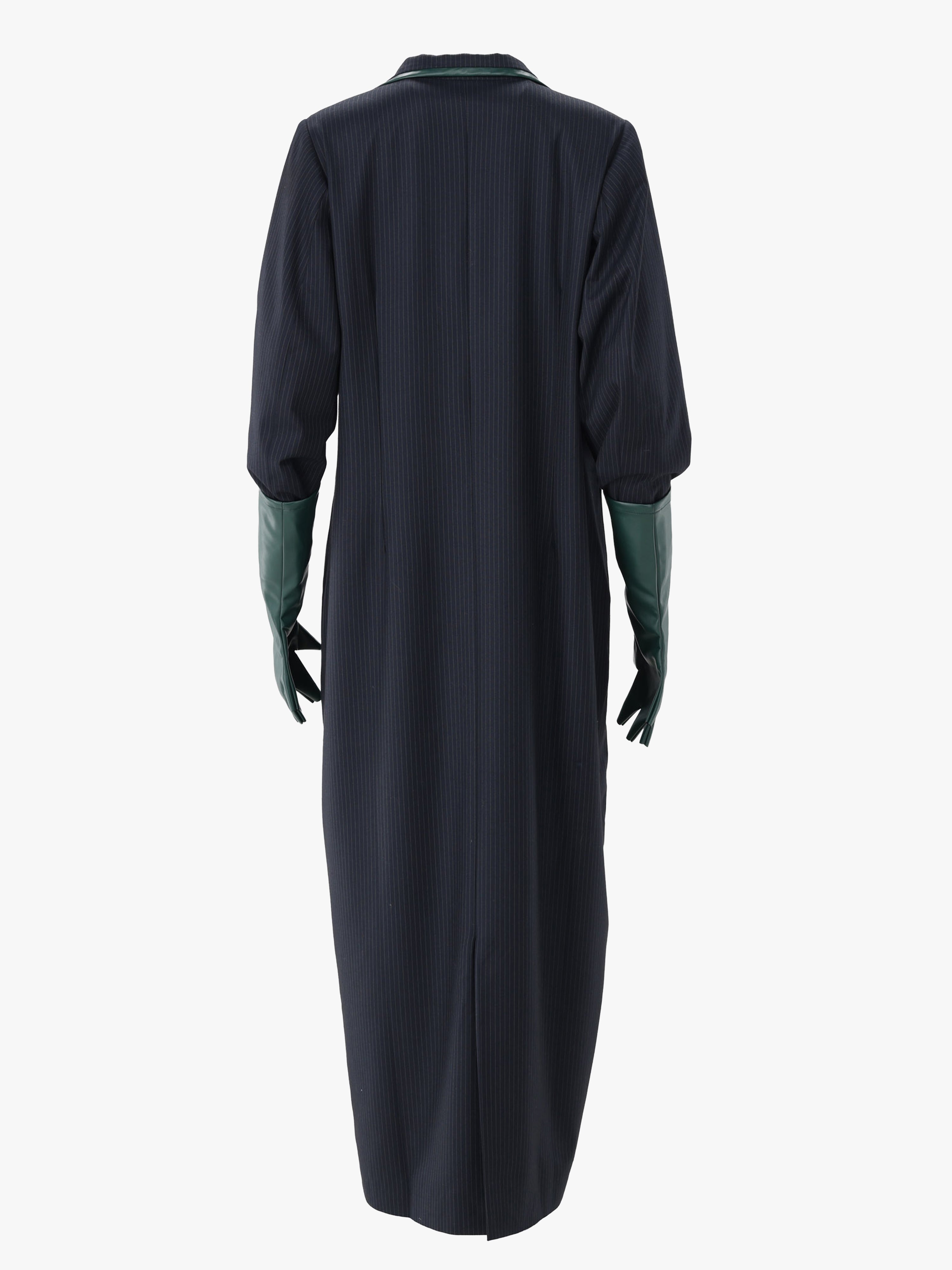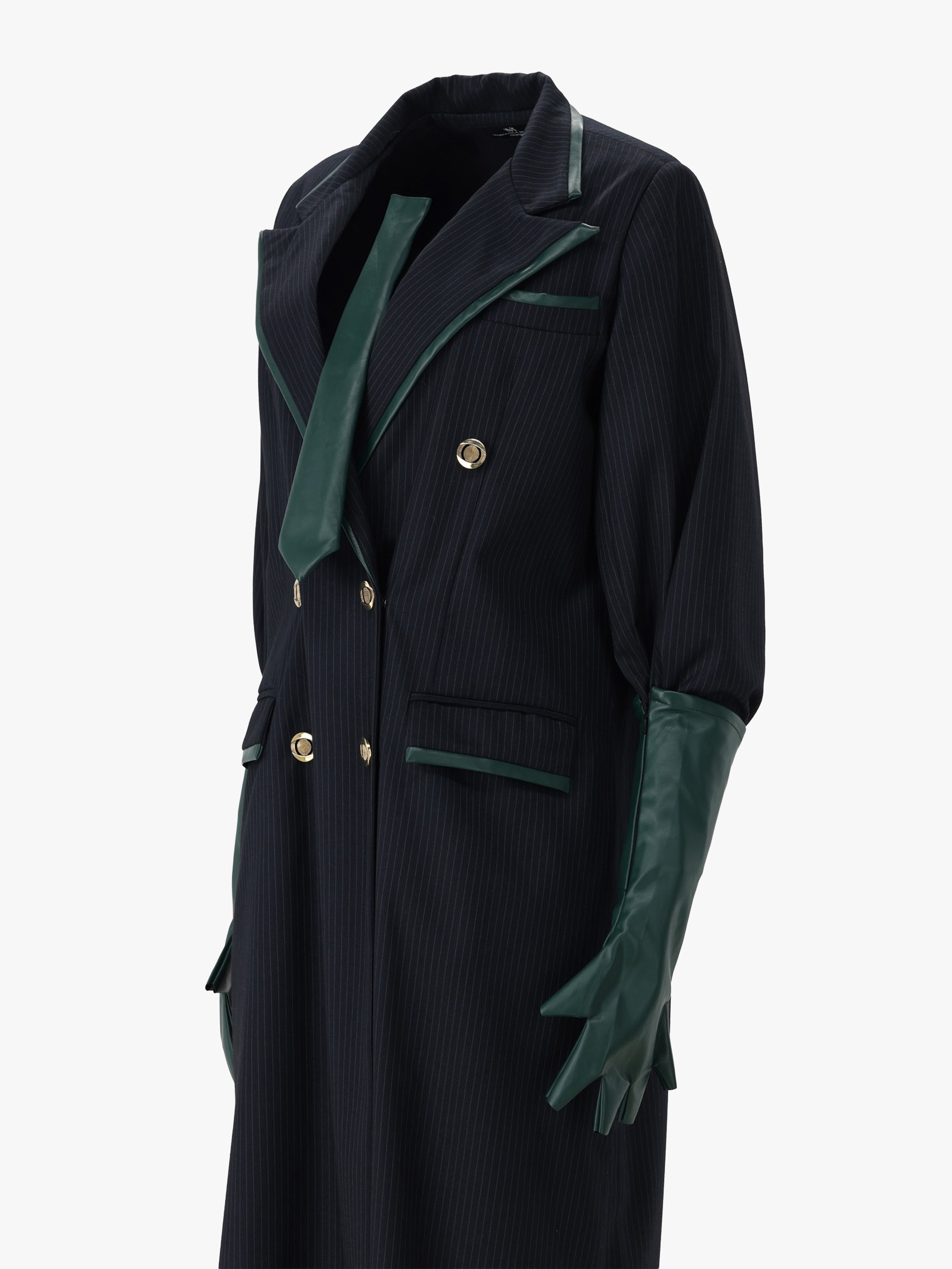 Hidden internal architecture shapes the torso, while elongated proportions create authority with grace. The gloves-integrated sleeves introduce a striking twist: a seamless fusion of suiting and sleek finish, symbolizing capability disguised as elegance—the soft hand of strategy with the iron discipline beneath.