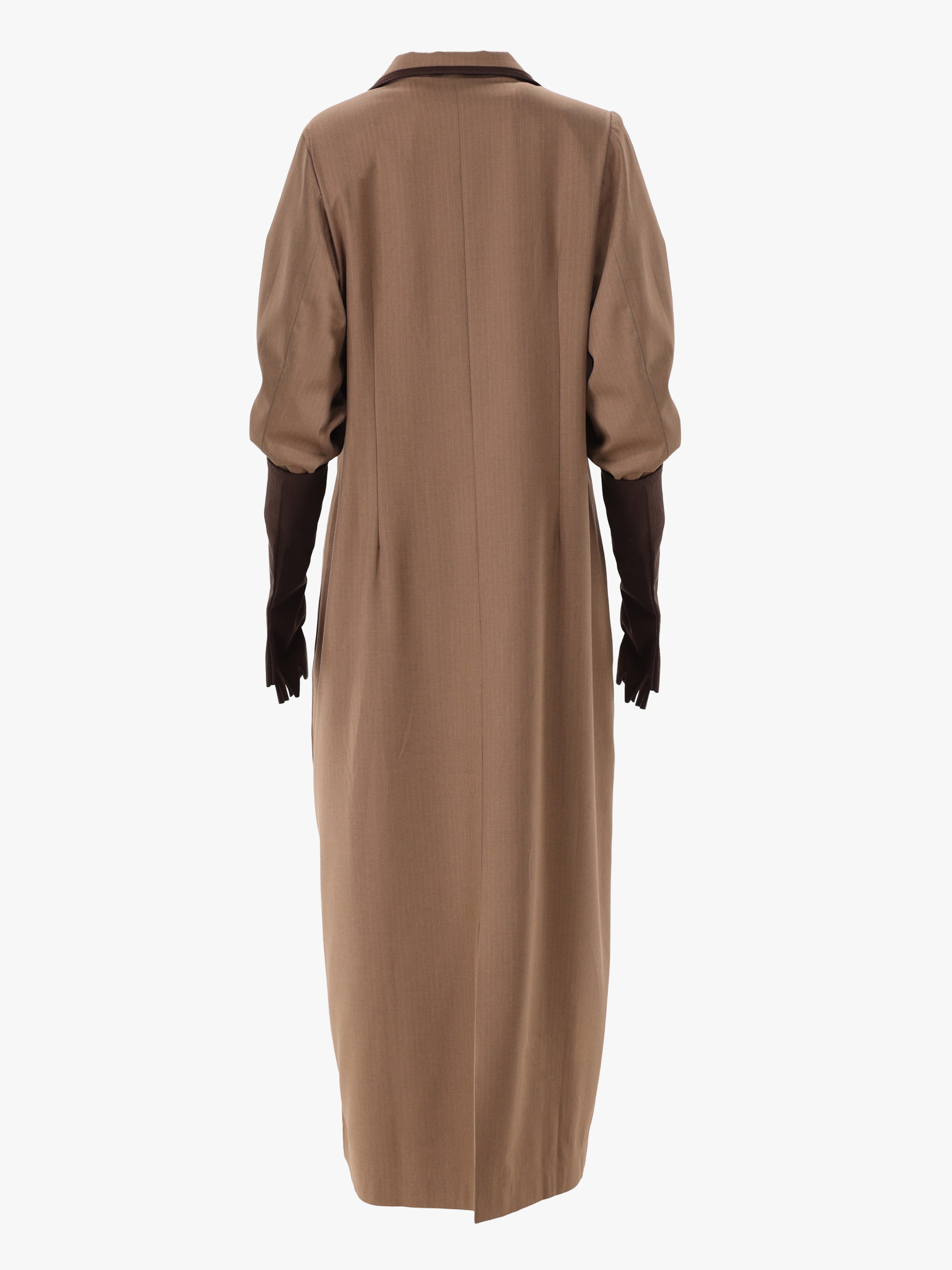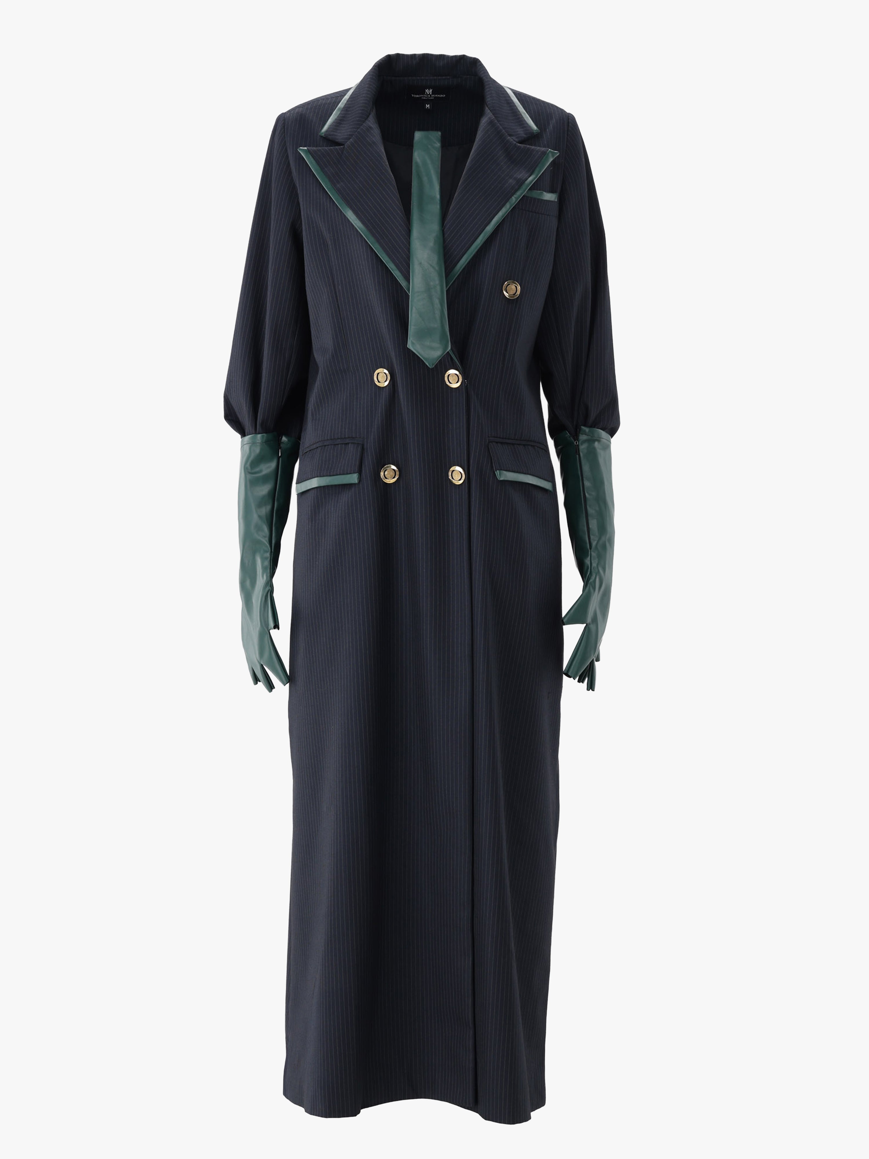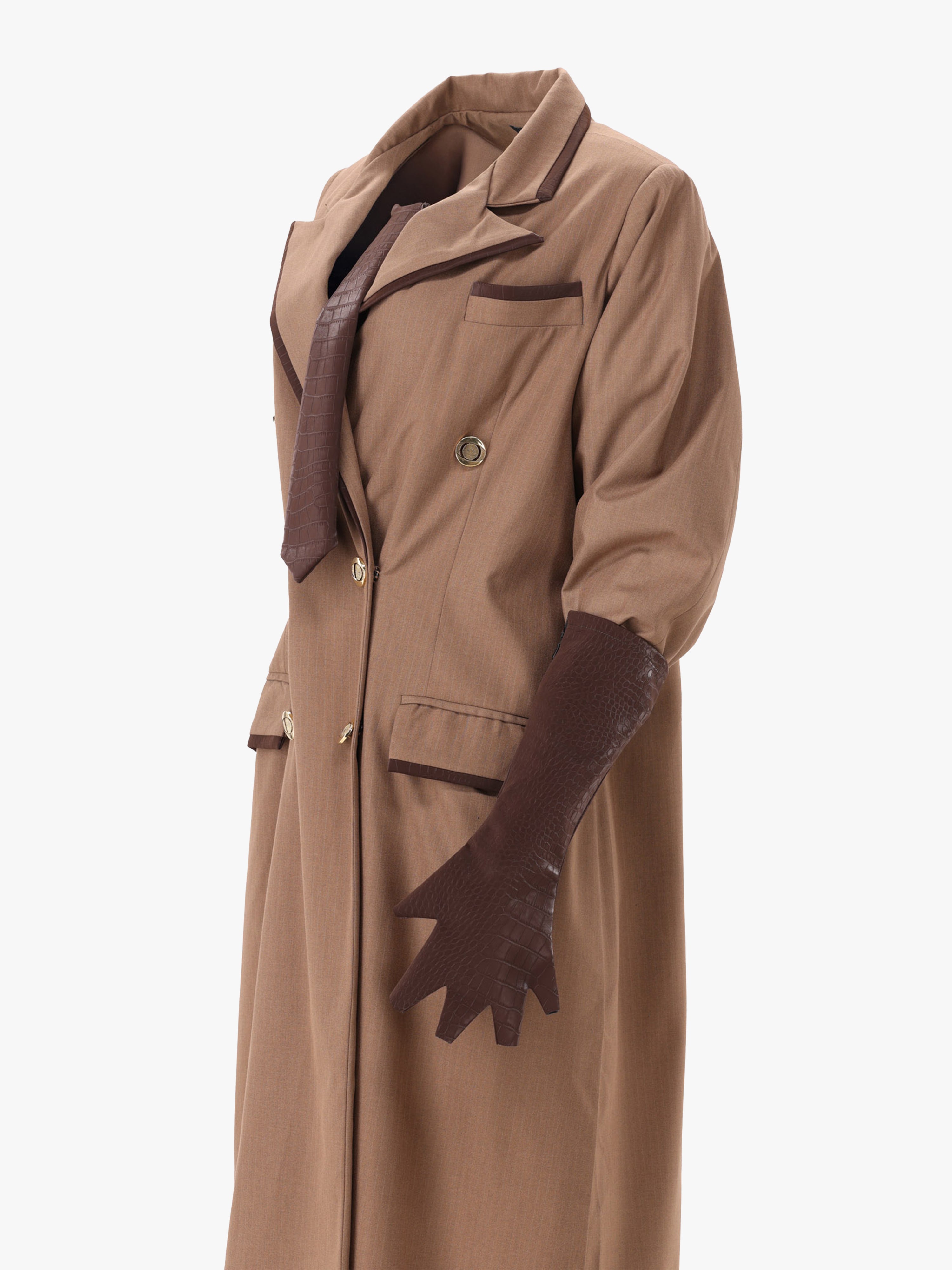 Hidden internal architecture shapes the torso, while elongated proportions create authority with grace. The gloves-integrated sleeves introduce a striking twist: a seamless fusion of suiting and sleek finish, symbolizing capability disguised as elegance—the soft hand of strategy with the iron discipline beneath.