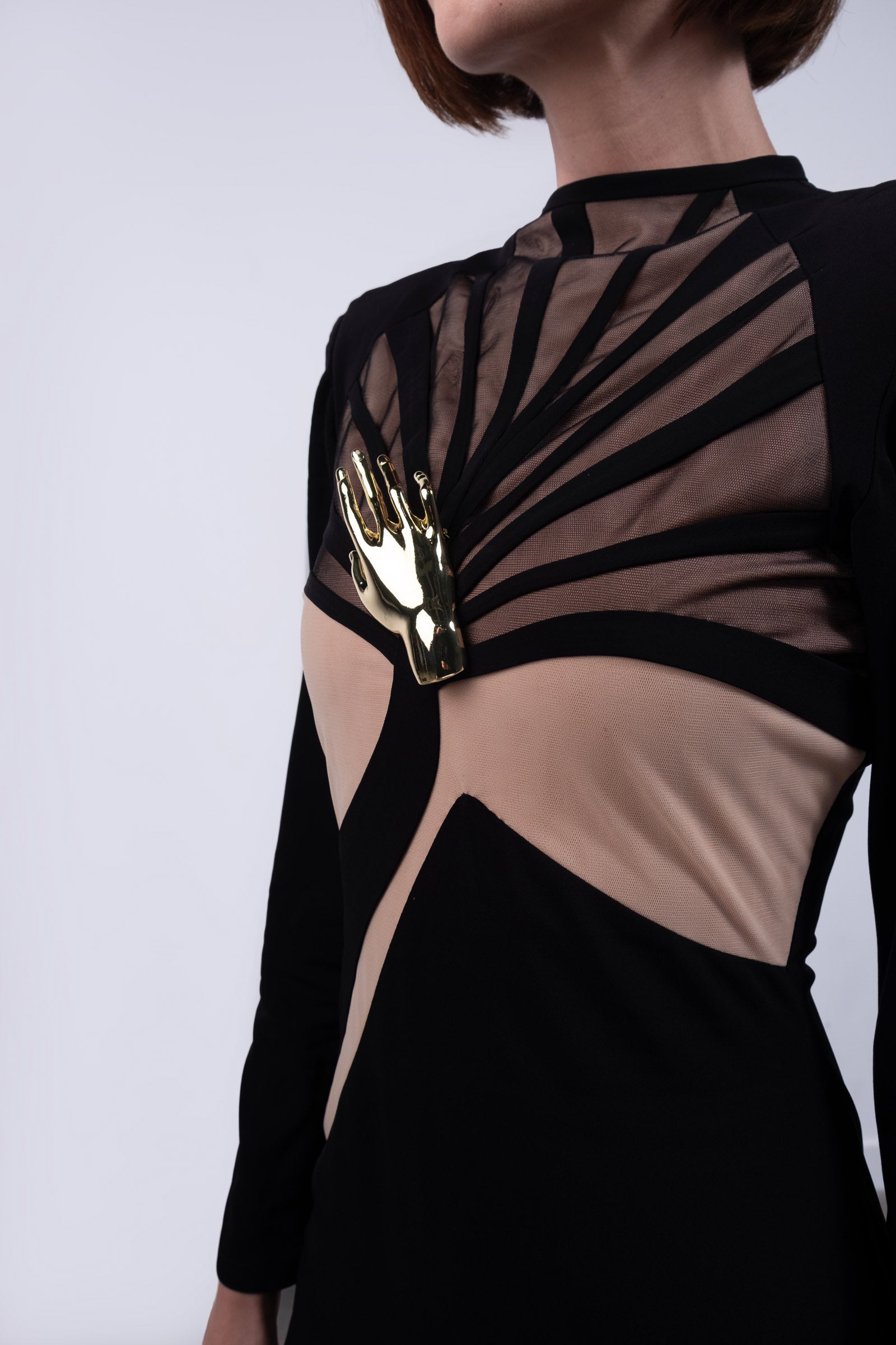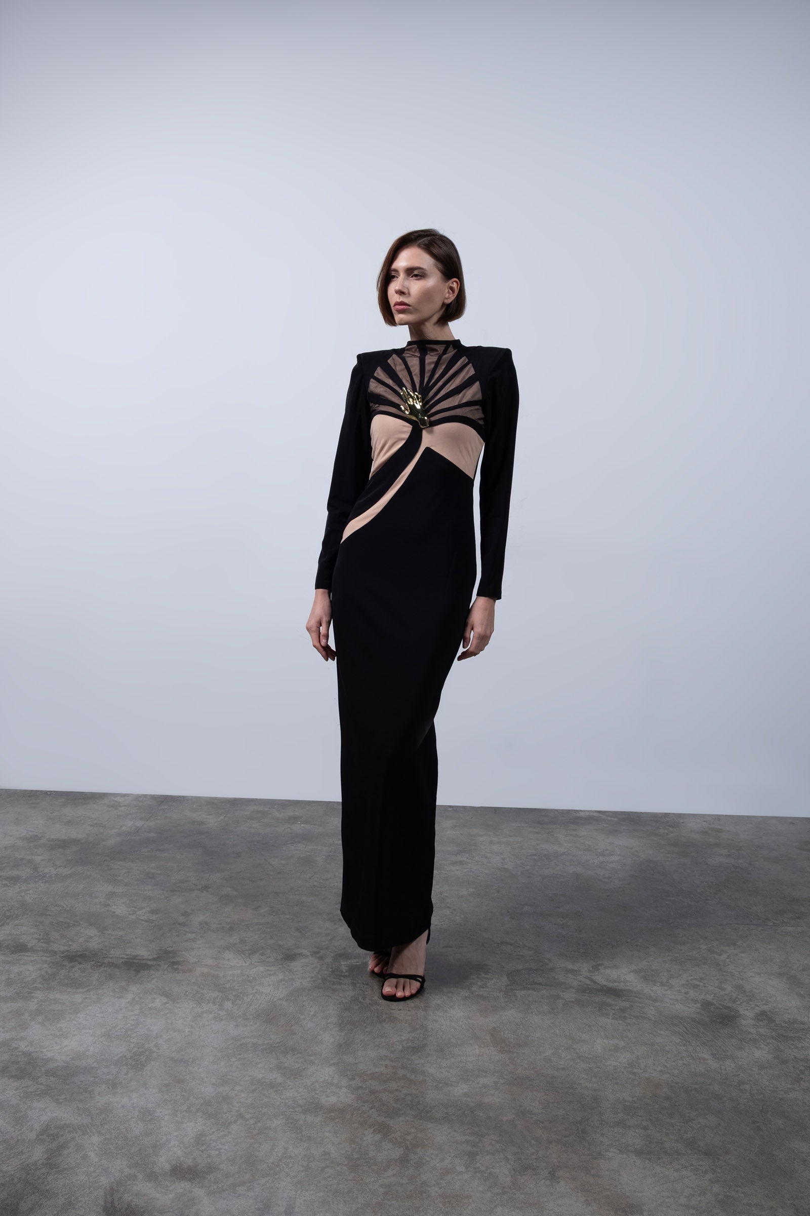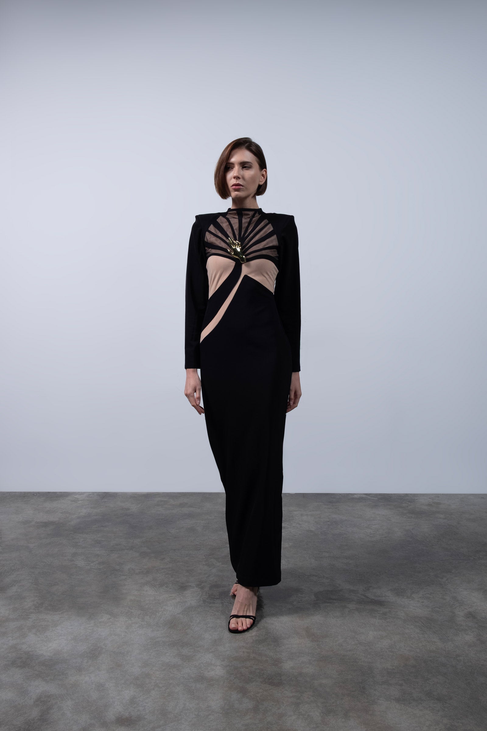 A sculptural ode to dominance and elegance, this gown fuses geometric precision with feral sensuality. The body is carved with curved paneling that contours and elongates, while the chest features fan-shaped mesh lines that radiate outward like a tiger’s expanding breath before attack—calm, centered, unstoppable. The dramatic shoulder line reinforces a commanding silhouette, and at the heart of the bodice, a gold tiger claw rests over the sternum—a symbol of protection, pride, and the sacred power of the feminine. The interplay of opaque black and warm nude mesh creates a second-skin effect, striking the perfect balance between vulnerability and strength.
