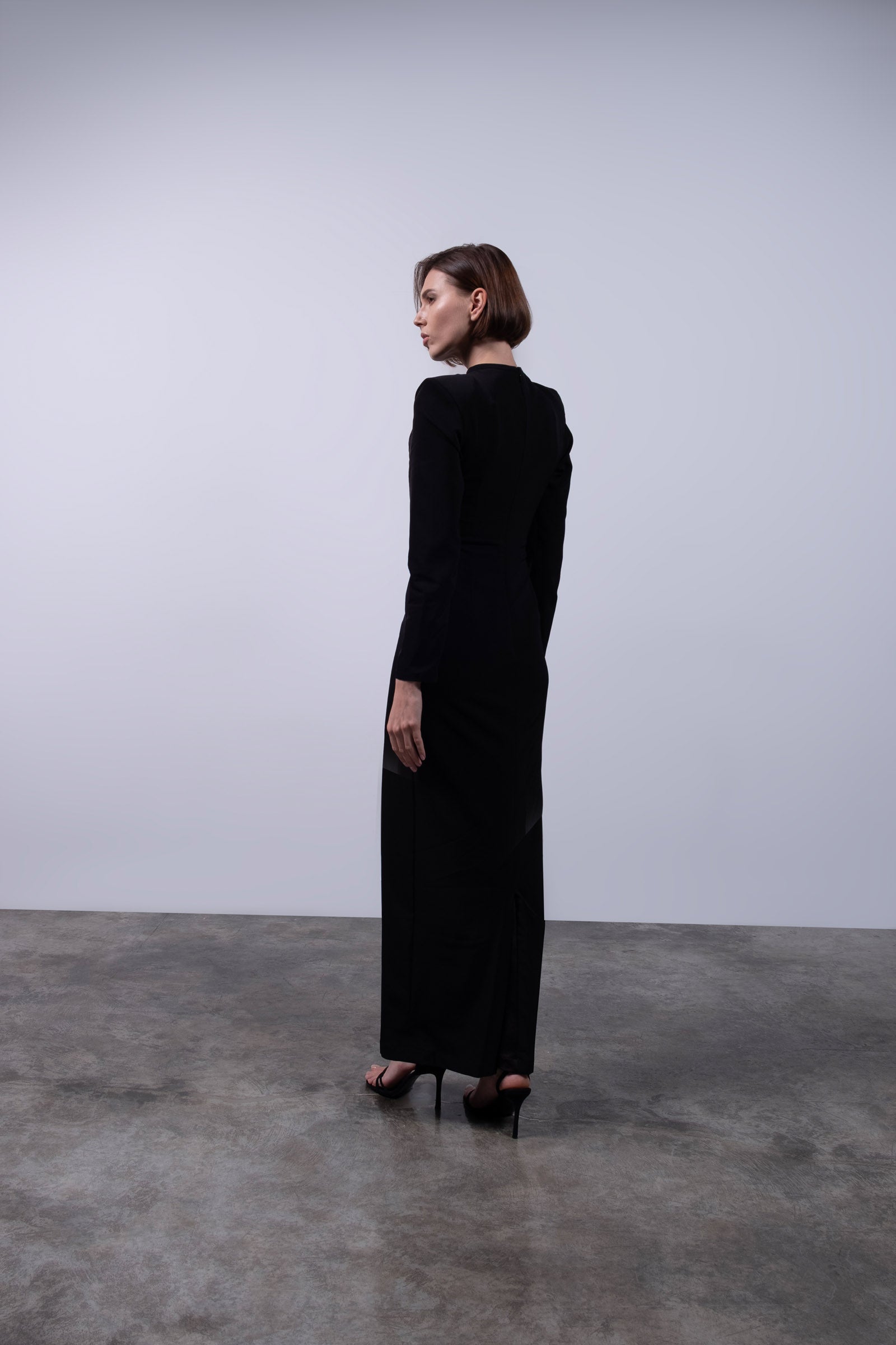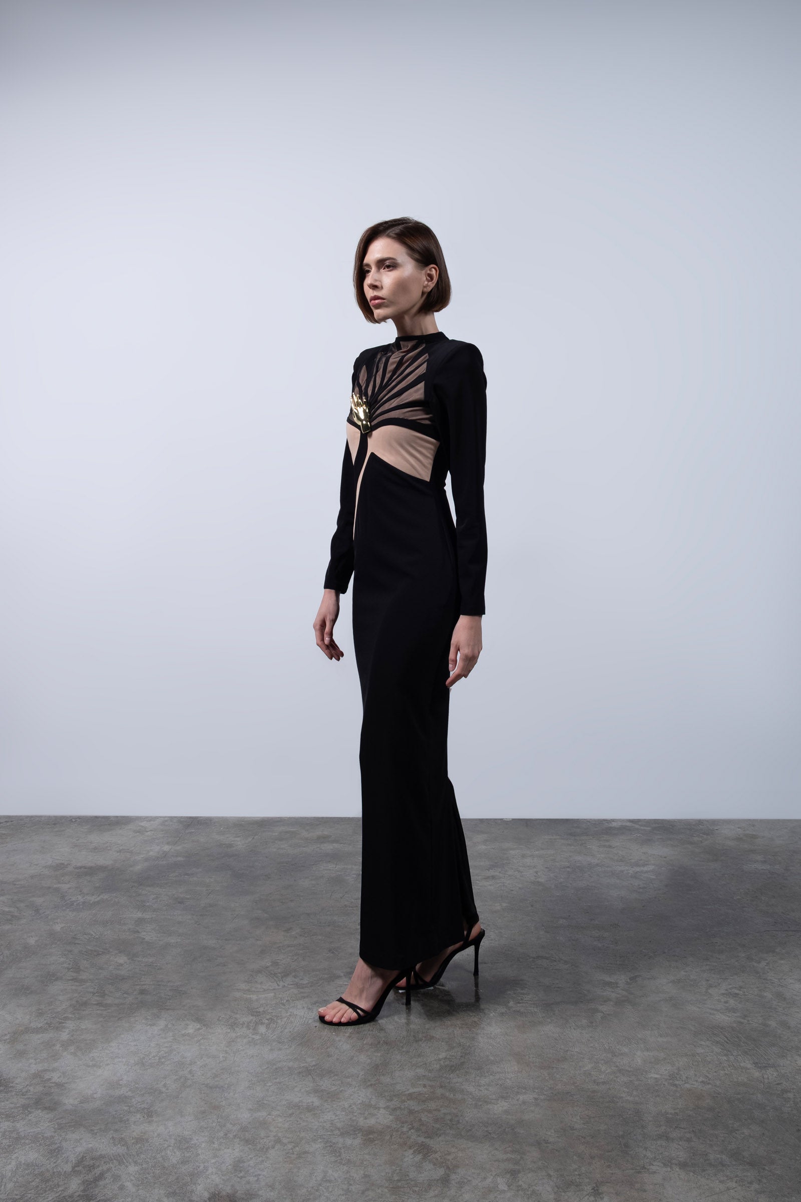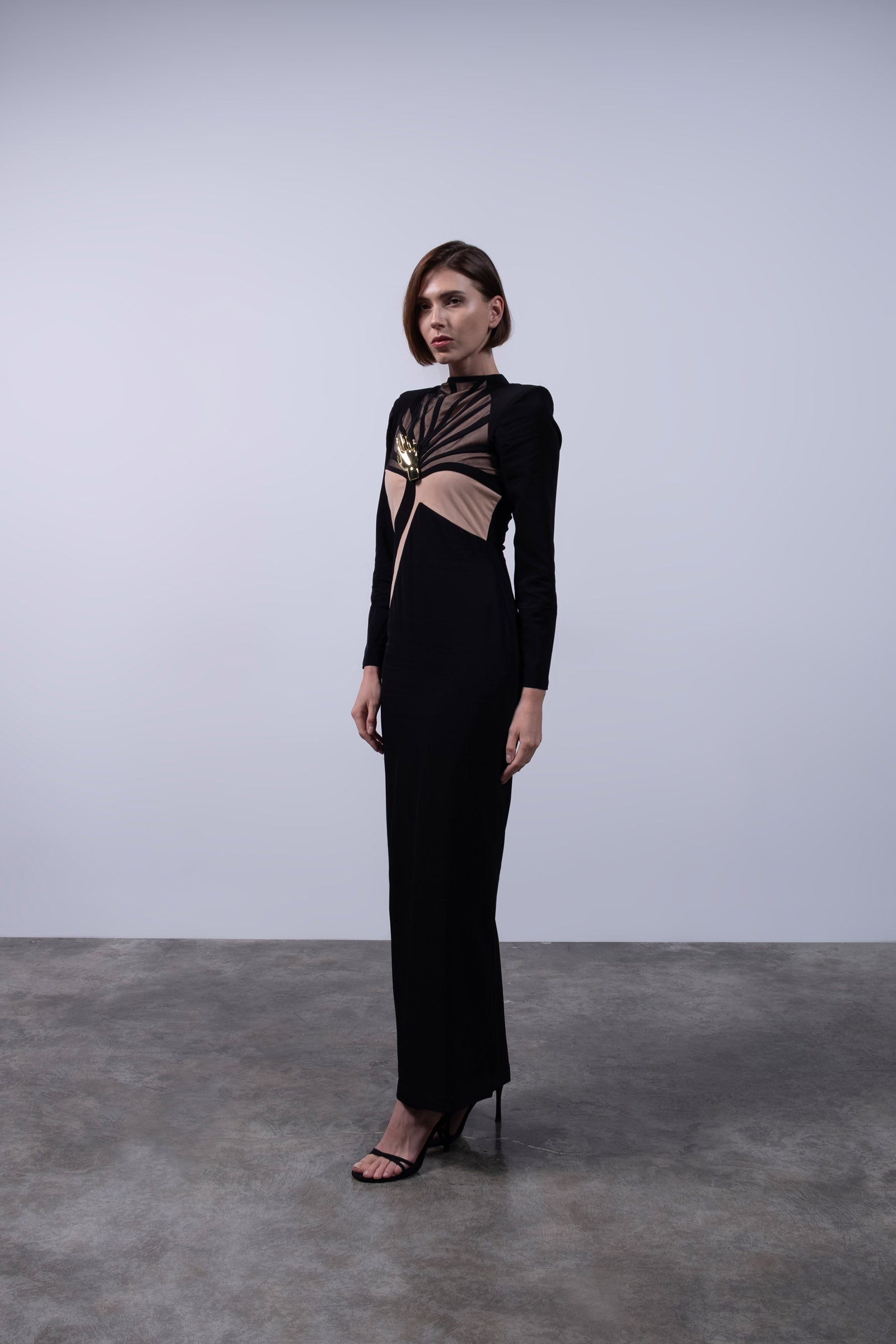A sculptural ode to dominance and elegance, this gown fuses geometric precision with feral sensuality. The body is carved with curved paneling that contours and elongates, while the chest features fan-shaped mesh lines that radiate outward like a tiger’s expanding breath before attack—calm, centered, unstoppable. The dramatic shoulder line reinforces a commanding silhouette, and at the heart of the bodice, a gold tiger claw rests over the sternum—a symbol of protection, pride, and the sacred power of the feminine. The interplay of opaque black and warm nude mesh creates a second-skin effect, striking the perfect balance between vulnerability and strength.